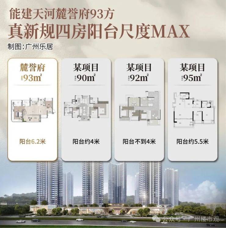 建面约93㎡四房户型,其阳台尺度更是做到了6.2米!