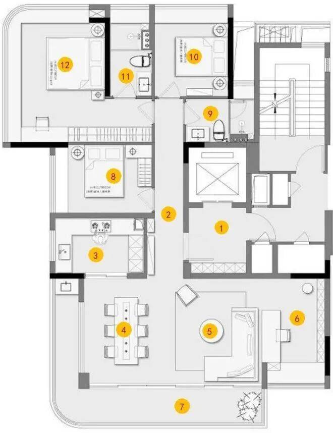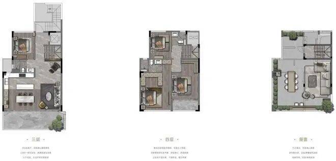 上叠为整栋楼的3-5层,3层主要设置次卧、公卫、客饭厅、厨房等,可以安排长辈居住,避免上下楼不便。