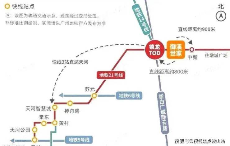 距离地铁21号线中新站(约1000米)、地铁14/21号线镇龙站(约1000米),快线3站到天河,7站到珠江新城。