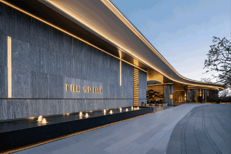 前庭门楼已大美呈现,流畅曲线勾勒檐顶,璀璨星空顶搭配奢石墙面和地面,名贵黑松迎于门前,大宅气派和归家仪式感呼之欲出。