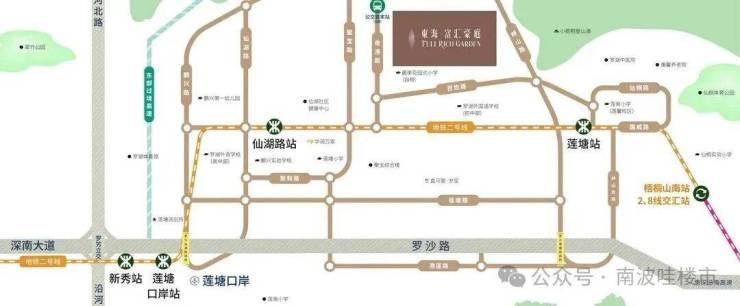 距离地铁2号线莲塘站A出口仅约500米,直达万象城、金光华等商圈,两站即达莲塘口岸。(数据来源:百度地图)