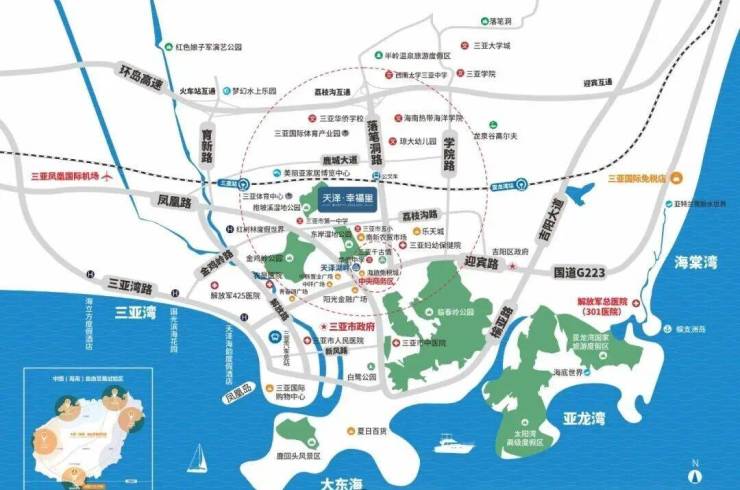 “全省规模最大的三亚市妇幼保健院”距离项目约500米;三亚市人民医院、农垦医院、三亚市中医院等“三甲医院”以及解放军425医院,解放军301医院。