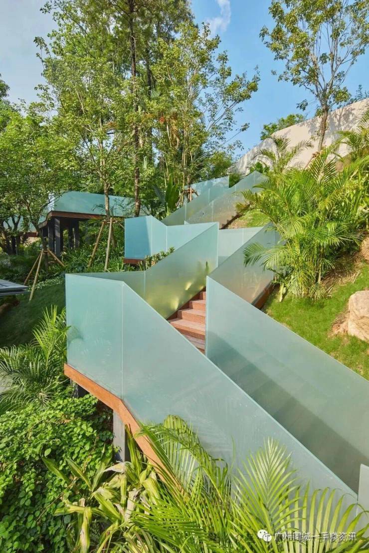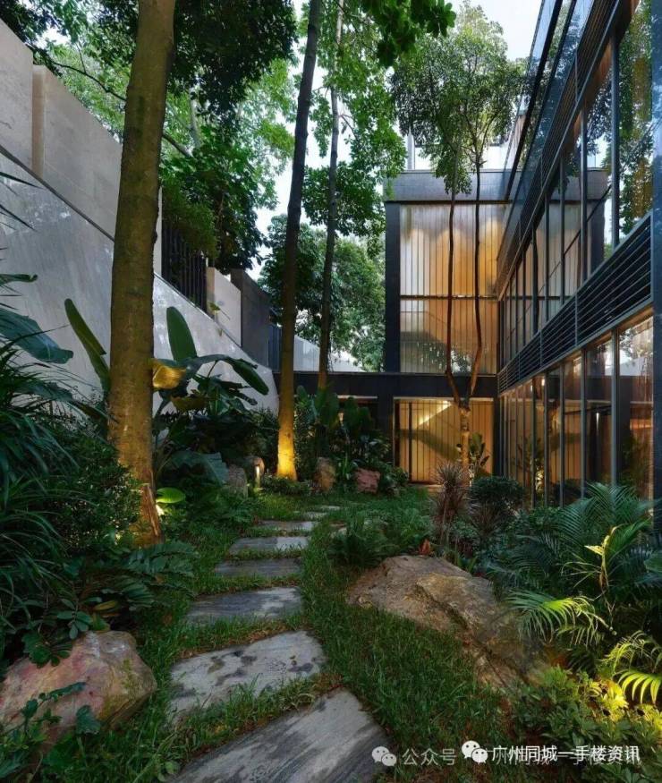 自然博览区则是就地取材,保留很多原生乔木,也种植了不少热带植物,俨然一个自然雨林。沿着这条林荫小径可以直接通往别墅东侧二层的入口。