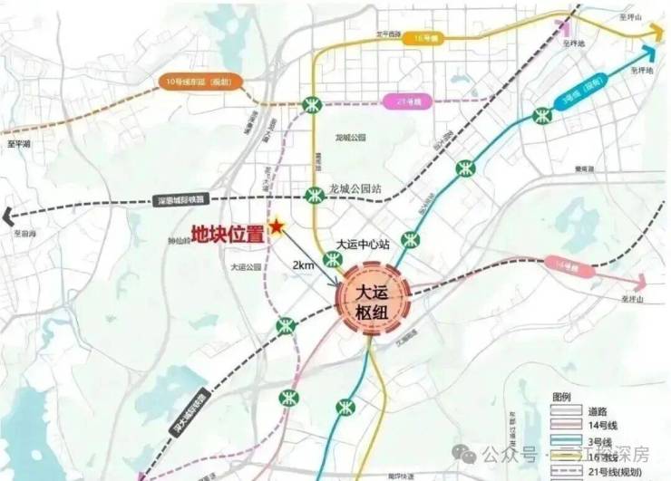 项目距离地铁16号线“大运中心站”约800米,步行约10分钟,1站可到达大运枢纽,快速换乘3/14号线,以及未来的深大城际;距离深惠城际“大运北站”约1公里,目前仍在建设当中,计划在2026年11月份通车。