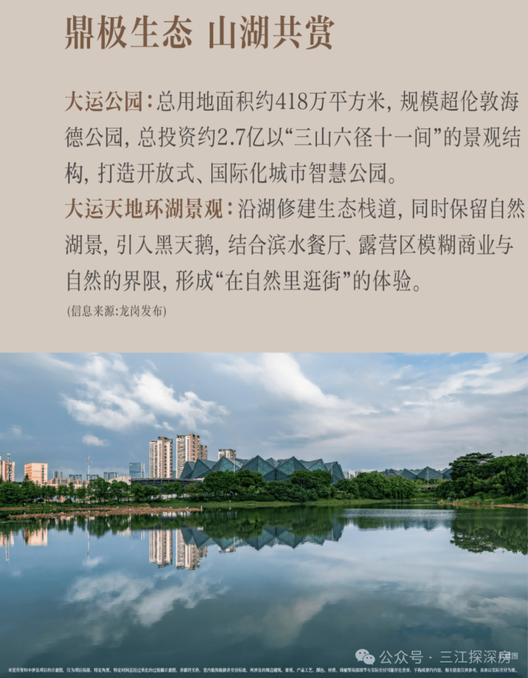 坐享大运公园(约418万㎡)、龙城公园(约189万㎡),环境优美,绿化率超50%,绿化率是福田中心的5倍、前海中心的4倍,是深圳首个“国家级生态示范区”。