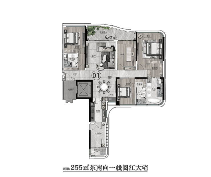 7栋约255㎡奢华大宅,以“景观阳台+工作阳台”南北双阳台户型设计,创造通透对流的空间格局。四季清风穿堂拂过,带走空间热量与浊气,带来清爽的新鲜空气。