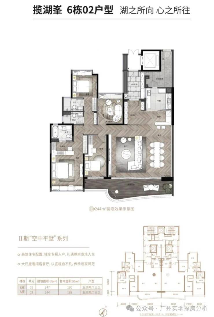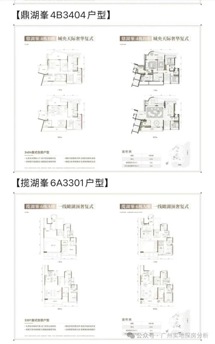户型多样:涵盖建面约83-247㎡二至五房平层,以及185-826㎡瞰湖复式、顶复产品。其中,大平层户型多为南向一线望湖,复式产品以“双钥匙双入户”设计为亮点,兼顾隐私与仪式感。