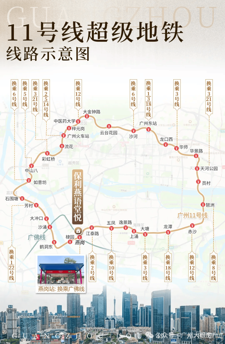 而且燕岗地铁站还是广佛线跟11号线大环线的交汇点,便利度非常的高,对于需要地铁出行的人群来说很友好,尤其是在珠金琶上班的,11号线环线开通后,8站就能直达琶洲,通过广佛线换乘3号线,到珠城也不过是7个站。