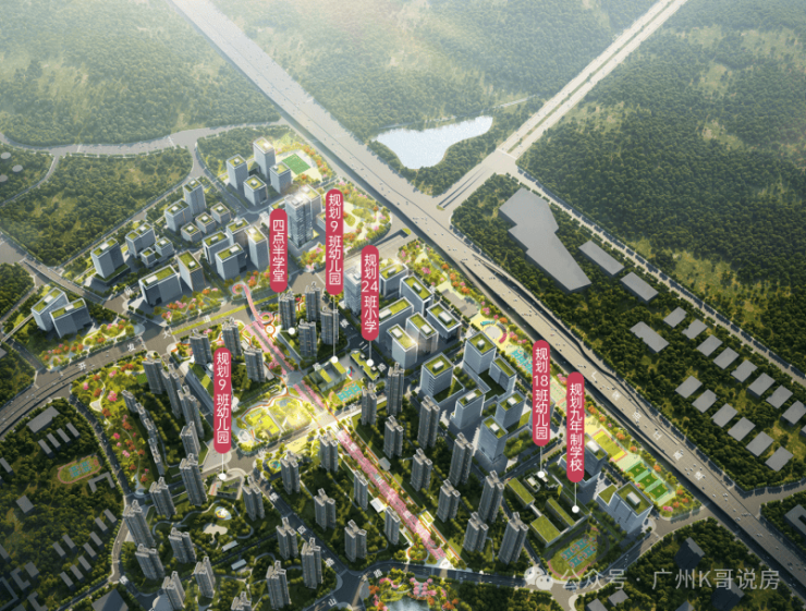 项目还规划了一所24班的小学,后期还会配建一所45班的九年一贯制学校。4所幼儿园更是大手笔,规划了18班+18班+15班+9班,完全对标黄埔新城的教育配套;