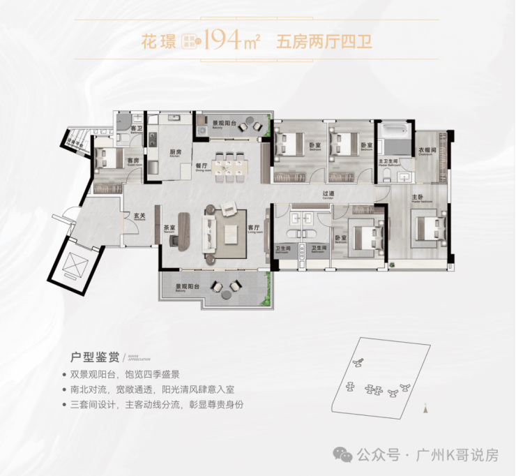 【194㎡五房2厅4卫(三套房)】南北对流双景观阳台,观景生活两不误