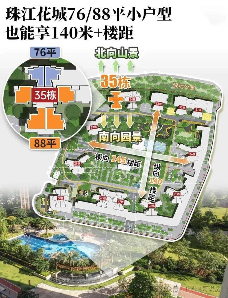 珠江花城加推六期34-35号楼,总层高26层,88㎡3+1房户型,相比于五期,优势是26层小高层,以及南向望花园。