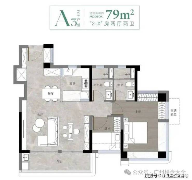 建面约79㎡三房两卫是项目的最小户型,非常抢手,还带入户花园设计。