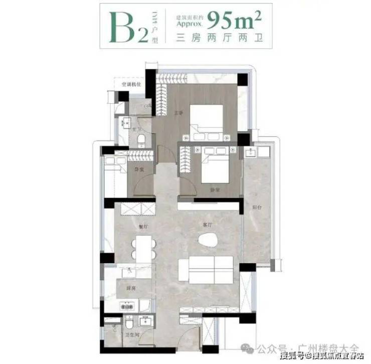 建面约95㎡三房两卫则是加大版的78㎡户型,空间感更为宽敞。这个户型是项目主推,货量是最多的。
