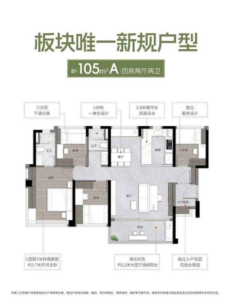 约105㎡户型,四房两厅两卫,南北对流户型,独立入户花园,客厅有约5米大宽厅,LDKB一体化设计,主卧带L型超7米转角飘窗。