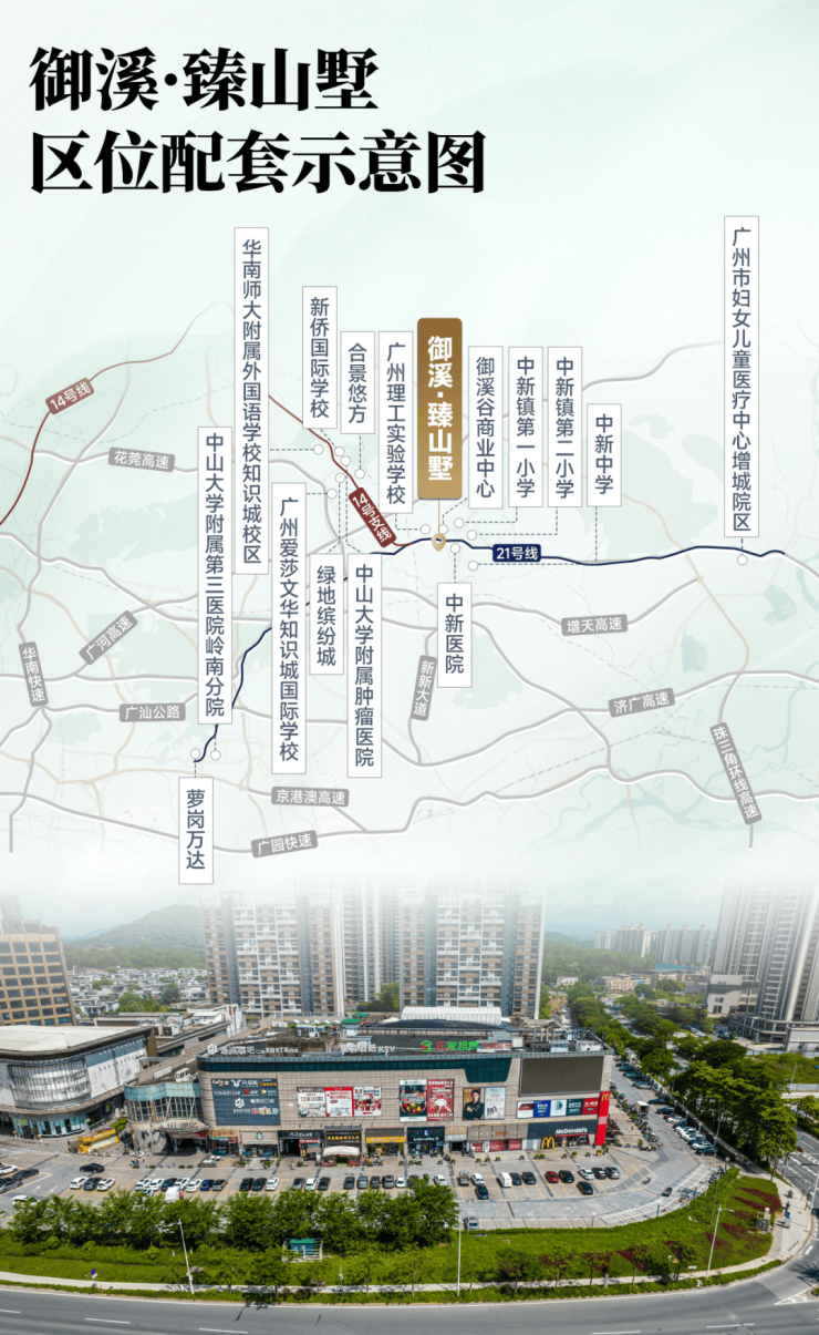 御溪·臻山墅坐落于广州第三中轴,毗邻知识城、科学城,却保持着与CBD恰到好处的距离,在山与城之间寻找到最佳平衡。周边配套也是相当齐全,不用担心在山里中新站直线仅约290米,镇龙站出发快线4站直达天河;论商业,约8万平LIFE御溪商商业已开业,无须奔赴天河,下楼即享繁华;