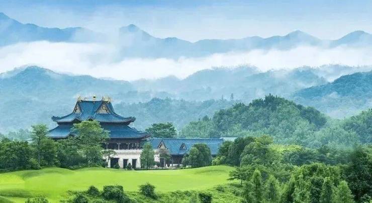 汉唐风格的建筑,掩映在层峦的群山和美丽的溪谷中