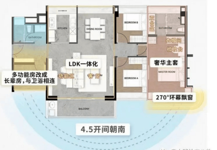 整体价值:约46㎡客餐厨空间+约26㎡南北对流主卧套房+4开间朝南+约14.5米南向采光面