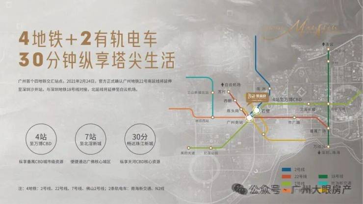 项目距南城中轴广场步行仅约300米,距2/7号线石壁站同样仅约300米,基于这种占位,你坐上7号线,1站到广州足球公园,3站到长隆欢乐世界,4站万博商圈,一条地铁你就能玩尽万长南黄金走廊。