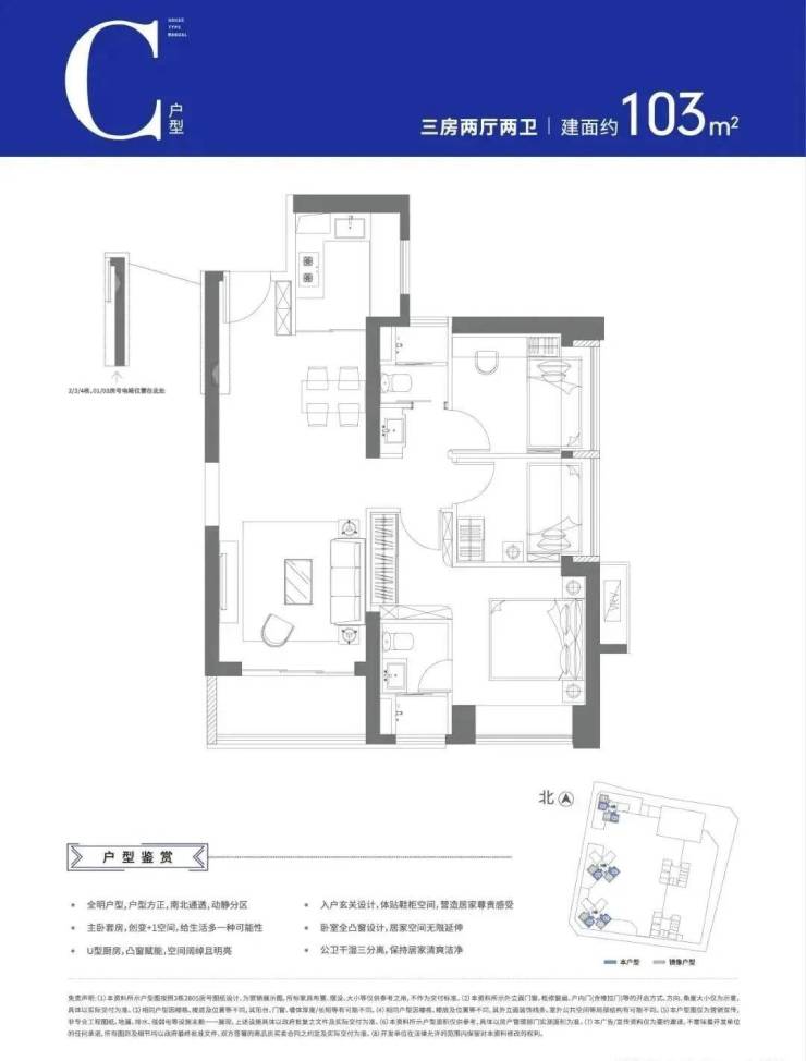 可售户型:103㎡三房两厅两卫、129㎡四房两厅两卫