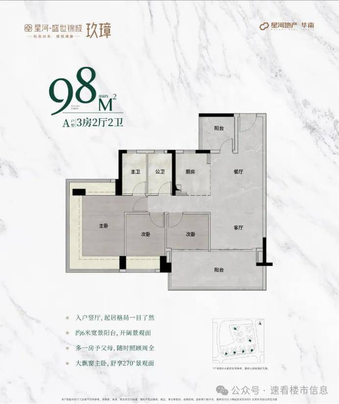 98㎡户型全新升级,主朝向朝南,让阳光洒满每一个角落。主卧配备 270° 无柱飘窗,视野开阔,美景尽收。次卧和阳台尺度大幅增加,提供更加舒适的居住体验,无论是休闲娱乐还是晾晒衣物都更加从容。