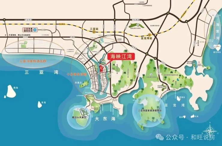 便捷交通:海映江湾项目位于河东路,北接迎宾路、南临鸿洲游艇码头,地处解放路与凤凰路之间。项目距三亚湾直线1.3公里,车程约6分钟可达三亚汽车站(约1.4公里),约13分钟至大东海旅游区(5公里),37分钟抵凤凰机场(14公里),40分钟达海棠湾(26公里)