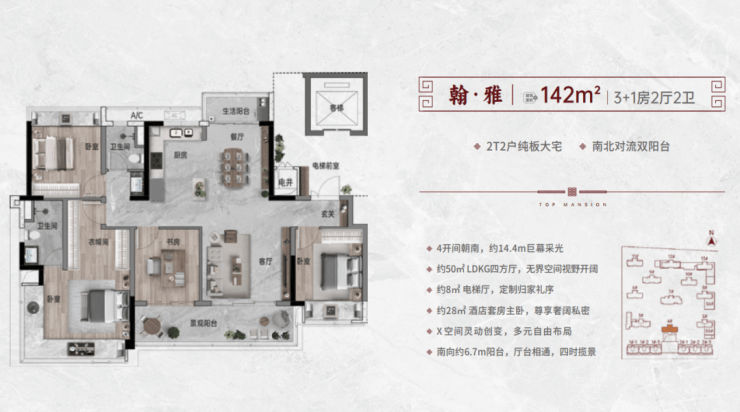 南北对流双阳台 | 4开间朝南,约14.4米全面屏采光 |约28㎡酒店套房主卧