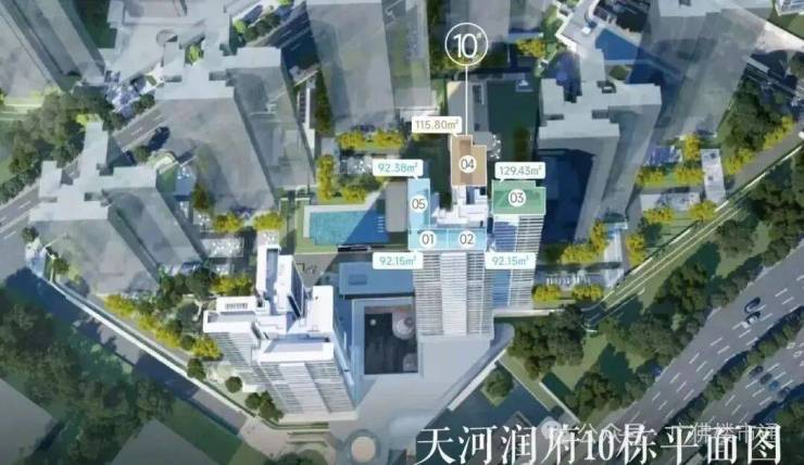 华润天河润府分为两个地块开发,北地块共建了4栋住宅,南地块则配建8栋住宅,目前主要在售北地块的1-2-4栋的尾货,今年年底就可以收楼,建面81-130平三至四房产品。