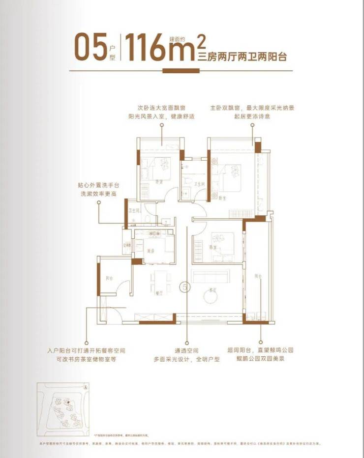 110㎡户型以其卓越的设计令人倾心,主朝向西南,带来充足的采光和通风。客厅、阳台和主卧尺度全面超越二期,空间更加开阔大气,彰显尊贵风范。宽敞的客厅是与家人共享欢乐时光的温馨港湾,舒适的主卧则为打造专属的私密空间。
