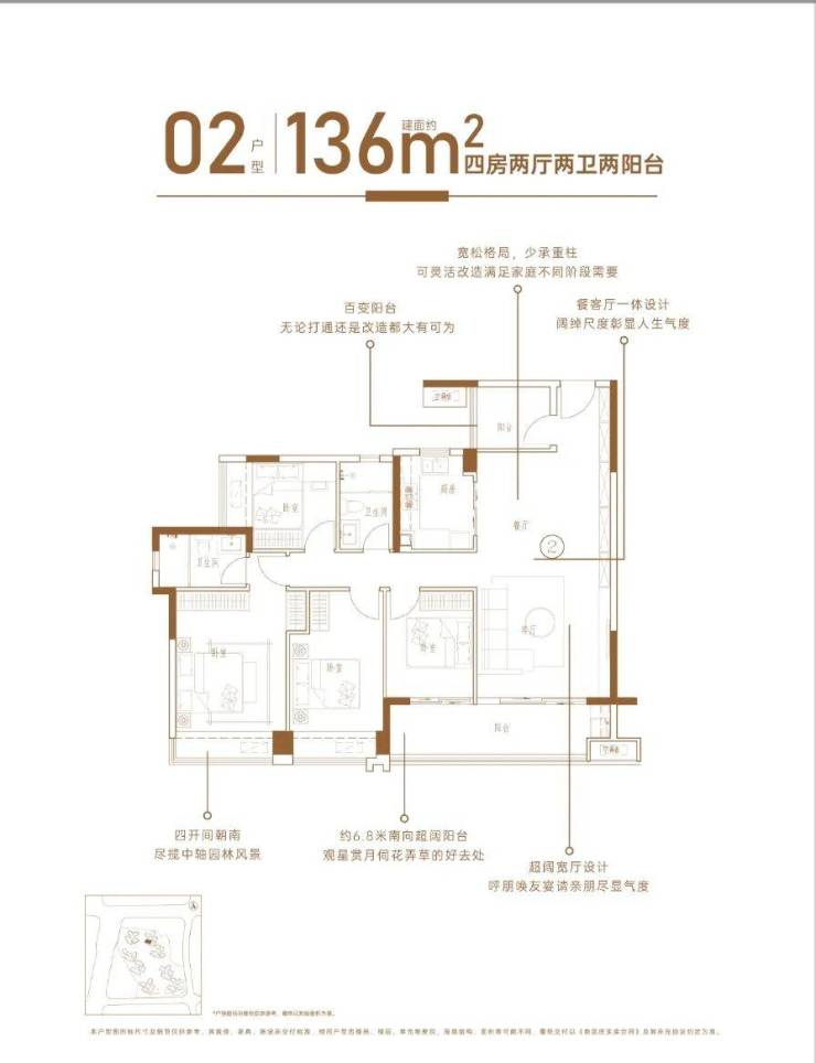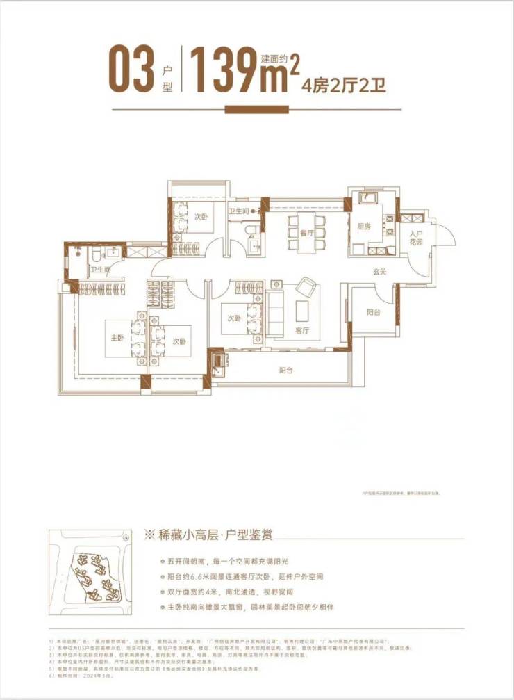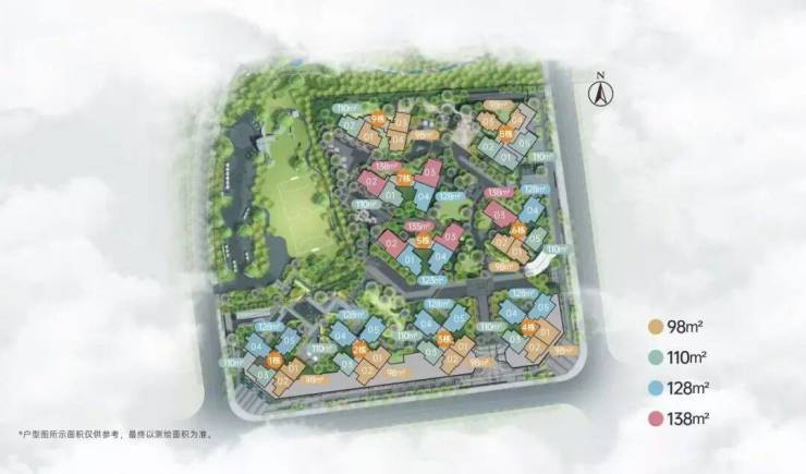 有三个面积段,98-110-128㎡三至四+1房,共有5个户型,都是新规设计,实用率达100%以上。