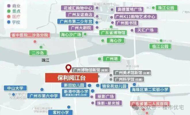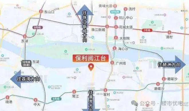 保利阅江台坐落于广州海珠区滨江东板块,交通网络发达,毗邻广州大道、广州大桥和滨江东路,直通CBD核心区域。同时,项目距离珠江仅约300米,可以尽享滨江的优美景致。