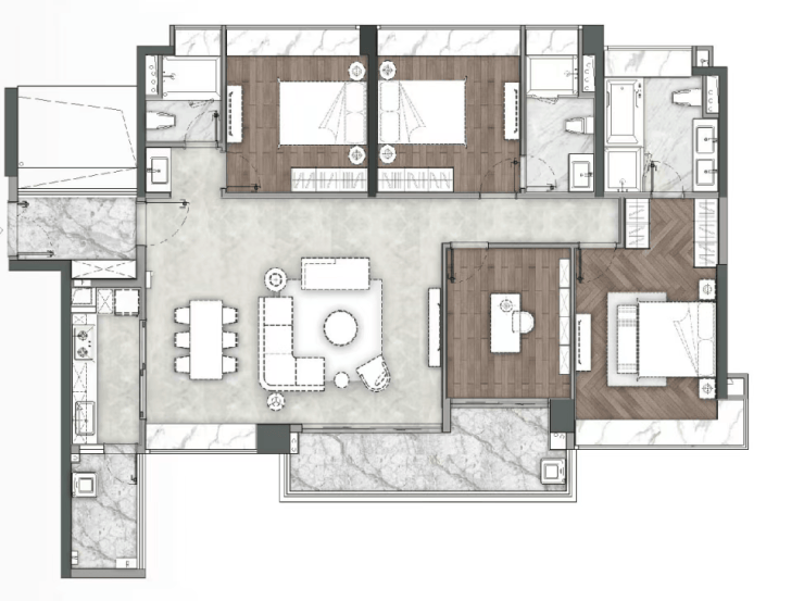 180–190㎡四房两厅三卫(A1/A2-03&04、A5-03):双主卧套房设计,超大观景阳台,部分户型配备独立家政间,满足高端改善需求。