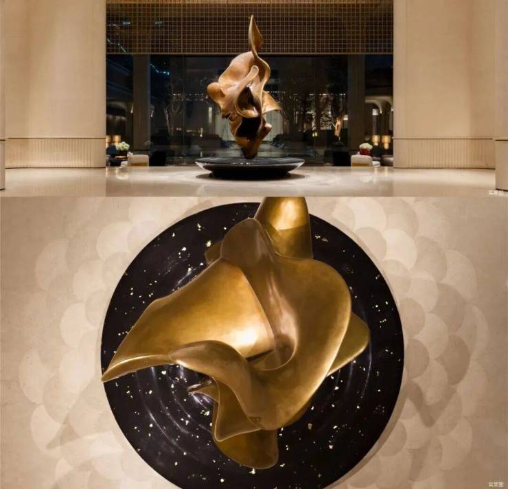 两吨重约7.5米高鎏金铜门,由我国国宝级非遗大师朱炳仁先生锻造,其中,铜金件上雕琢的凤鸟纹样,则取自北京保利艺术博物馆馆藏的海内孤品——周王鼎。步入此境,心绪于文明中穿梭,大家威仪自此展开。