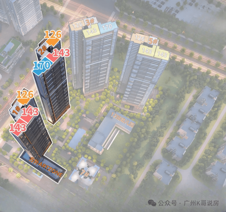 中海麓府体量不大,仅4栋住宅,40多层高的住宅(1#高40层,2-3#高44层,5#高41层),两梯三户,底下规划有1所12班幼儿园+1栋自持物业,货量在500套上下,它的面积段有三种,分别是建面约126㎡三房、143㎡和170㎡的四房。