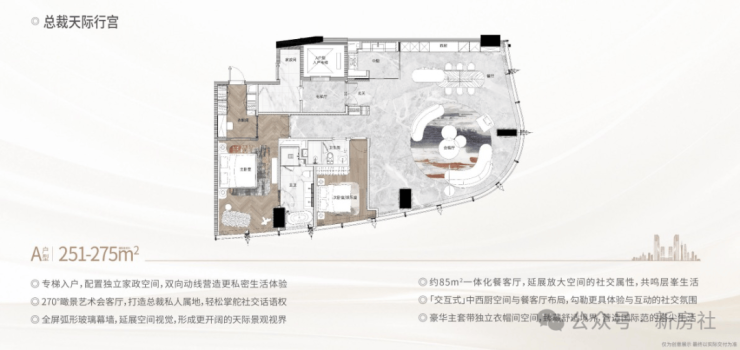 小区配套:项目集超甲办公、舒适大平层、总裁大平层、LOFT公寓、独栋办公、奢华酒店、高端商业等多元业态,打造事业、生活无界交融的一站式未来生活圈。