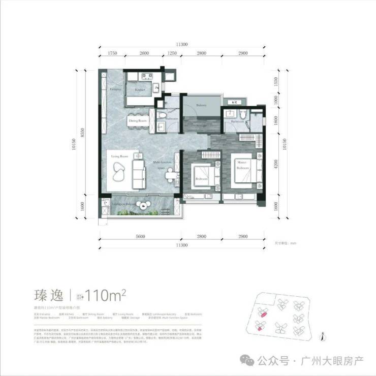 建面约𝟏𝟏𝟎m²户型【可改四房】,全开间朝南 约𝟏𝟏.𝟑米南向采光面