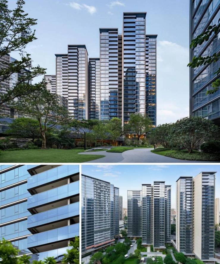 建筑外立面采用大面积玻璃+铝板+涂料组合,塔身运用类幕墙工艺,使建筑界面更显纯粹。特别选用的Low-E中空玻璃,完美融合高透光性与低透过性,既有效保障业主的隐私与室内隔热性能,又实现了建筑与自然的和谐共生。