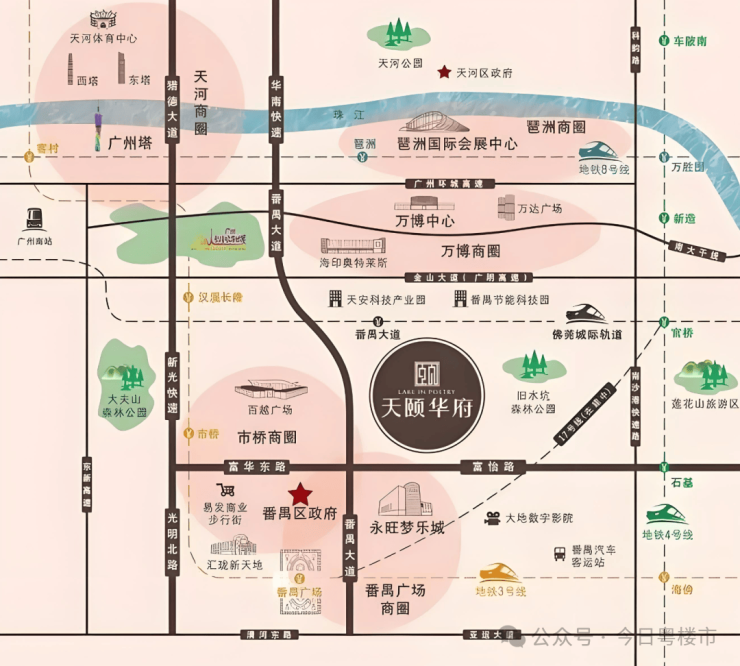 天颐华府位于番禺广场板块,可快速到达珠江新城。