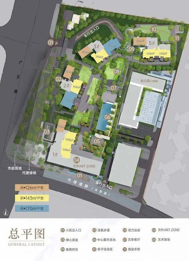中海麓府体量不大,仅4栋住宅,40多层高的住宅(1#高40层,2-3#高44层,5#高41层),两梯三户,底下规划有1所12班幼儿园+1栋自持物业,货量在500套上下,它的面积段有三种,分别是建面约126㎡三房、143㎡和170㎡的四房