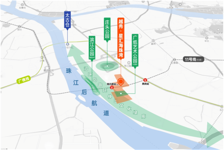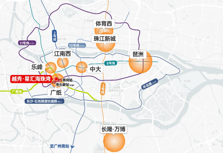 广州11号线(在建)贯穿项目,广州首条环城地铁,0换乘直达琵洲、广州火车站、广州东站;距广佛线燕岗站约450米,接入3号线,7站到达珠江新城;海珠环岛路(在建)工程进度不断刷新,价值即将兑现。