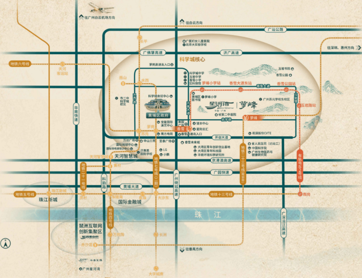 项目所在的科学城芯区府板块,地铁6号线香雪站就在附近,规划中的地铁23号线也将在家门口设站,在提供便利出行的同时,更拉近其与中心城区之间的距离。有轨电车1号线和2号线(在建中)贯穿左右,将打通黄埔区内部的交通壁垒。有轨电车2号线建成后,可与有轨电车1号、5号线路换乘,无缝接驳地铁6号线、13号线,为广大萝峰街坊提供多一种出行方式。