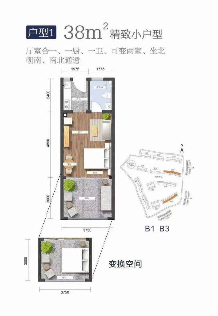 建筑面积38㎡,一室一卫,可变换两室,坐北朝南,南北通透,硬装交付
