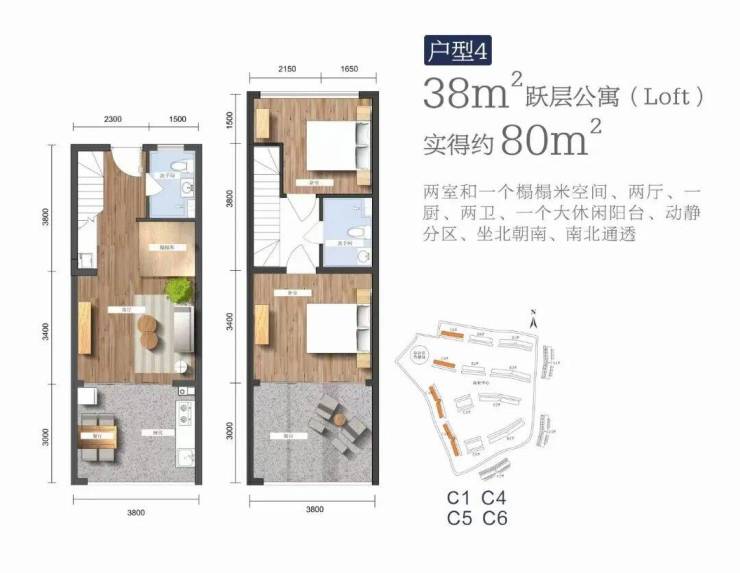 建筑面积38㎡跃层,实得面积约82㎡