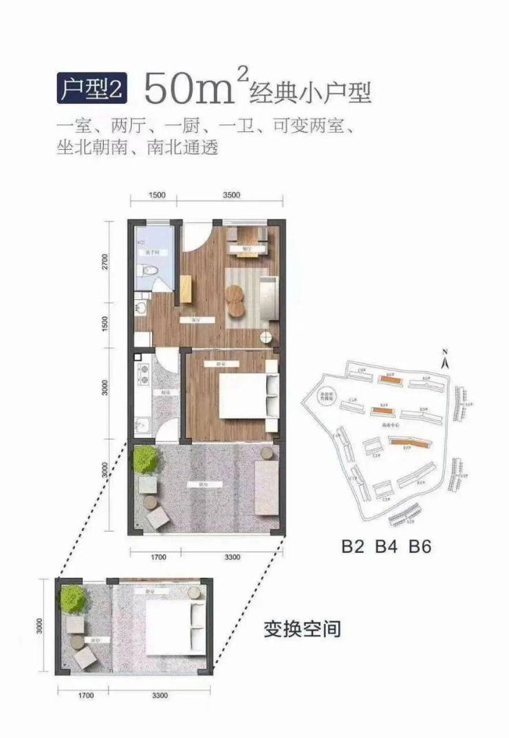 建筑面积51㎡,一室一厅一卫,可变换两室,坐北朝南,南北通透,硬装交付