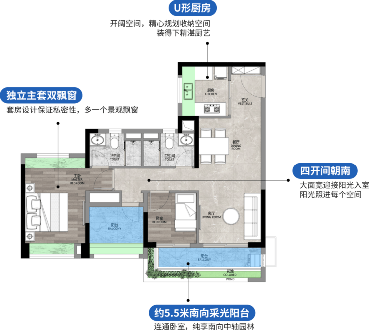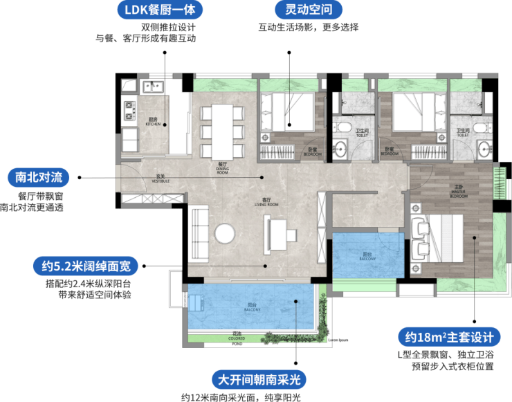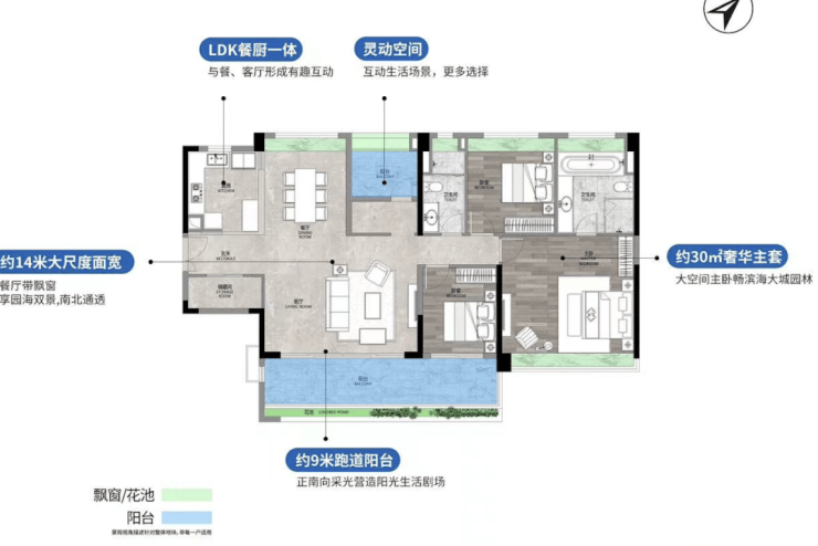 78㎡三房两厅两卫,全新升级三房,四开间朝南,超11米南向采光面,270度超大角度采光,直望广阔园景。