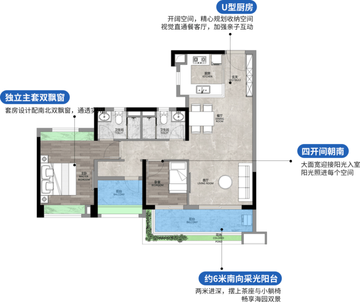 82㎡三房两卫,小户横厅重出江湖,片区内绝版横厅小户强势补货。南北对流,四开间超11米采光,270度超大角度采光,海园双景皆可拥有。