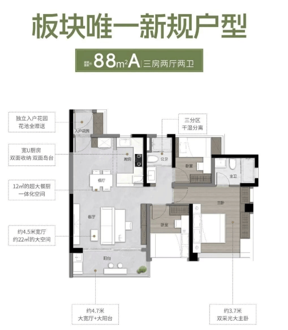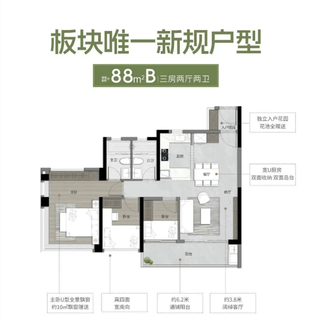 77㎡三房两厅两卫:三面宽南向+270°全景主卧+LDKB一体化公区;