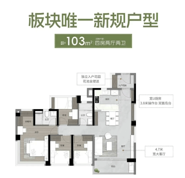103㎡/105㎡四房:独立入户花园、270°瞰景阳台、L型超7米转角飘窗;