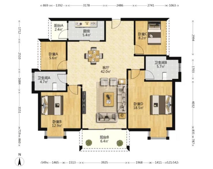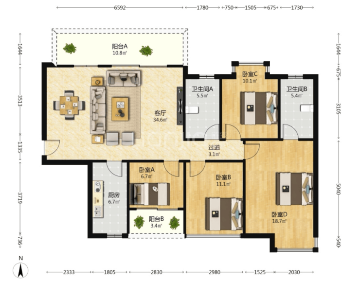 120㎡四房户型是二线江景房,户型比较方正、通透,客厅开间3.6米,有两个次卧略小一些。厨房在客厅后面,端菜到餐桌不太方便,这是该户型比较大的一个缺点。