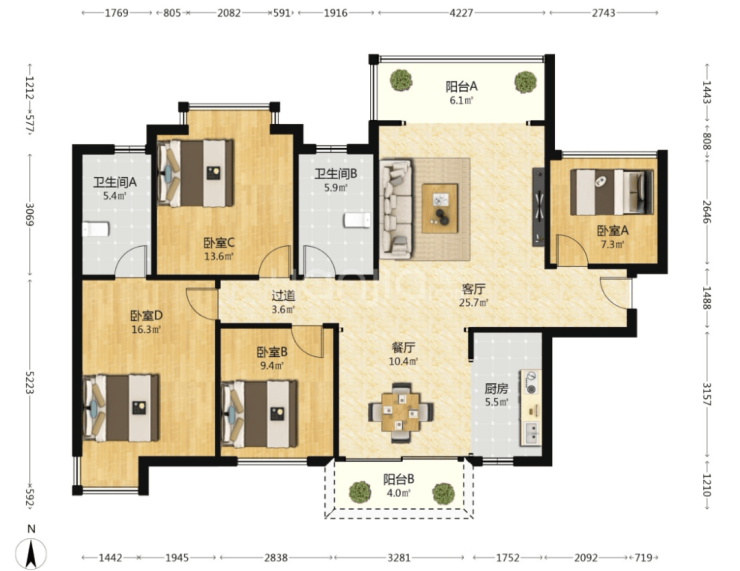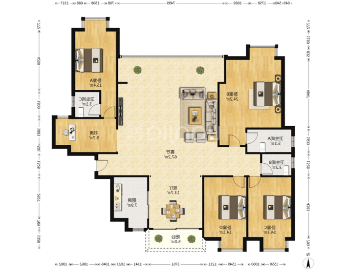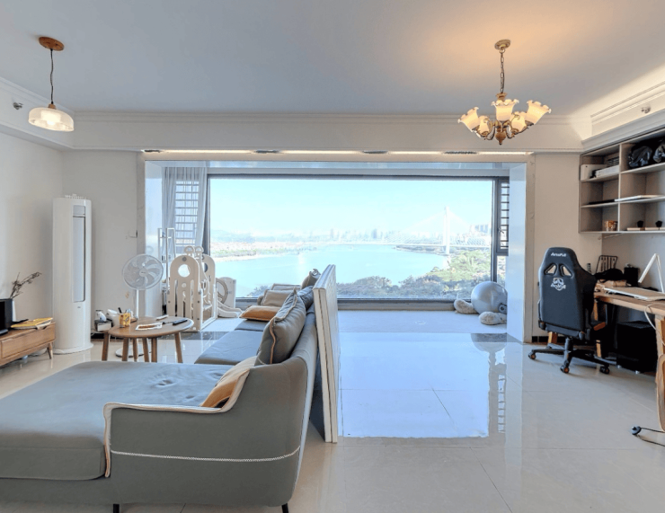 162㎡户型有五个卧室,适合大家庭居住,也是头排江景,客厅开间4米,主卧面积达21㎡,再多的衣服包包都放得下。