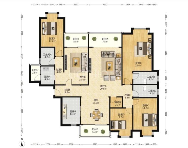 226㎡是该小区最大的户型,交付时是双套房设计,有两套厨卫、客厅、主卧,如果父母喜欢自己住,可以单独使用小套房,自己煮饭。双套房既能避免代际之间在生活习惯上的冲突,又方便相互照看。